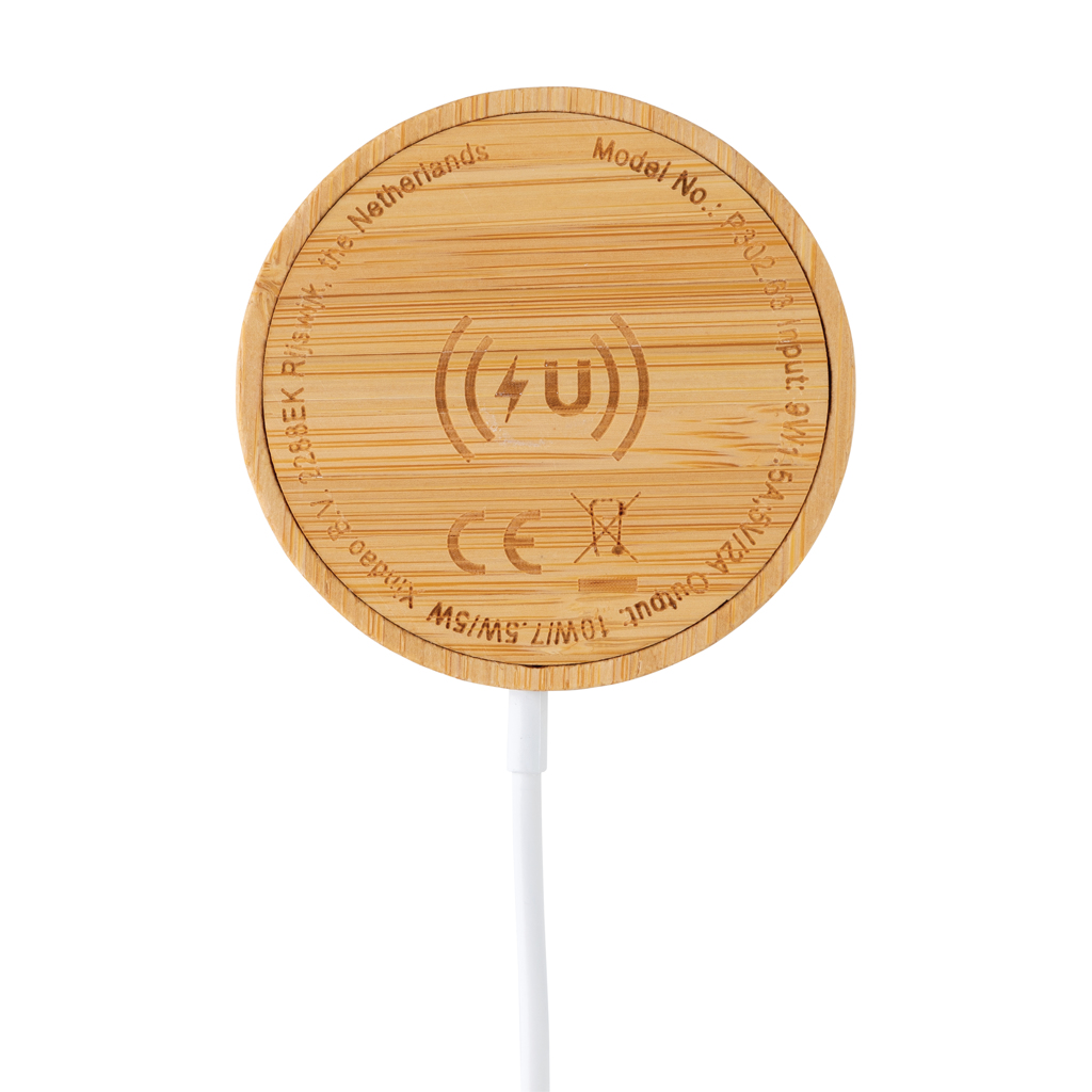 Snap on this magnetic wireless charger to the back of your iPhone 12 to charge your device. The magnets are perfectly aligned to always ensure the right charging position on your phone. The bamboo 10W wireless charger is compatible with all QI devices (Iphone 8 and up and Android devices), so on other phones it can be used as a regular wireless charger. Including 100 cm TPE material micro USB cable. Item and accessories PVC free. Input DC 5V/1.5A; Output 5V/2.0A (10W) 11 pcs high quality N52H heat resistant magnets integrated.
