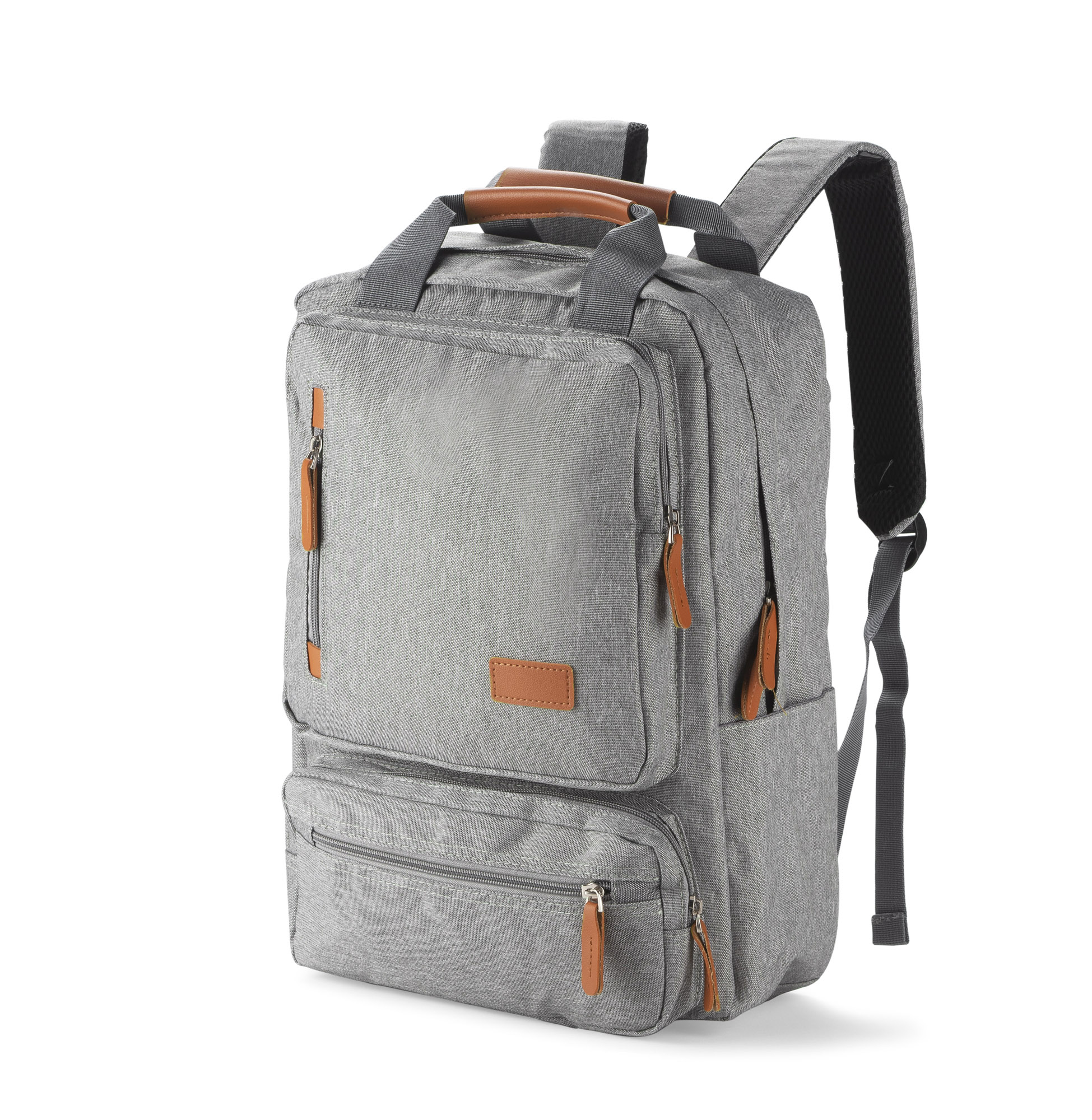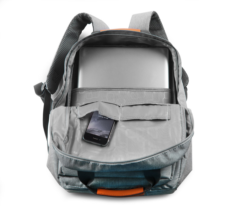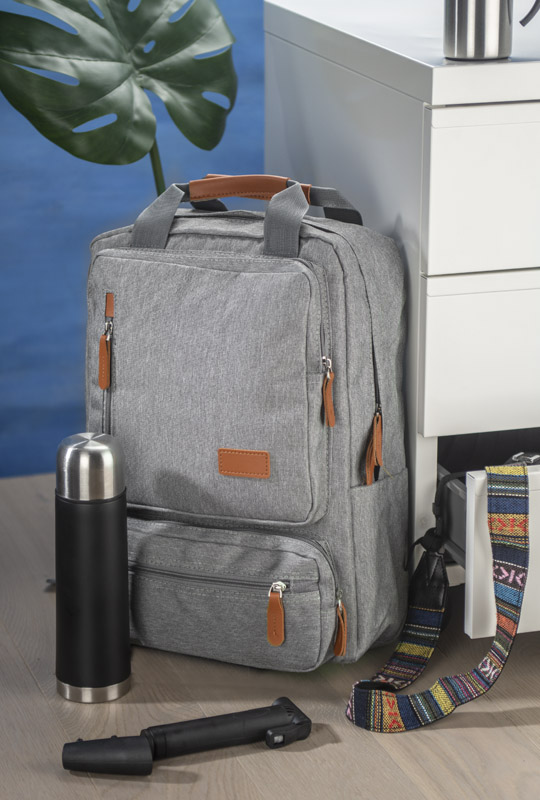The one-chamber PAKKU backpack is the perfect choice for both women and men. The grey colour makes it universal, and light brown elements made of eco-leather provide an interesting contrast. PAKKU is very spacious with five inside and six outside pockets – four zip-locked and two side pockets. In addition, it has two handles reinforced with eco-leather for easy holding. The backpack is made of 600D polyester.