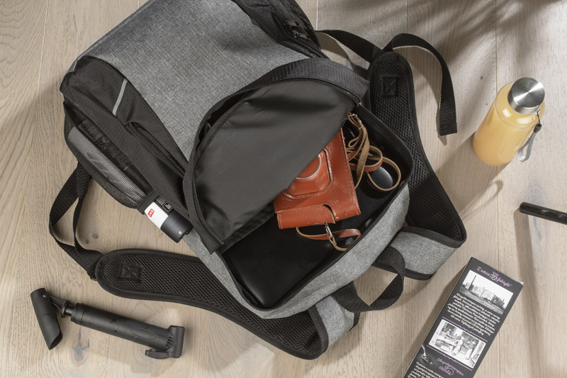 The UTILE backpack is made of 600D rPET polyester, which makes it more environmentally friendly. It has one main compartment with two zippers. There is also an additional open compartment inside. The bottom of the backpack is covered with a waterproof PVC coating. There are two zippered pockets on the front: a large one that can fit a lunch and a smaller one, just right for smaller items. On both sides there are small mesh pockets with an elastic band. The back is slightly reinforced.
