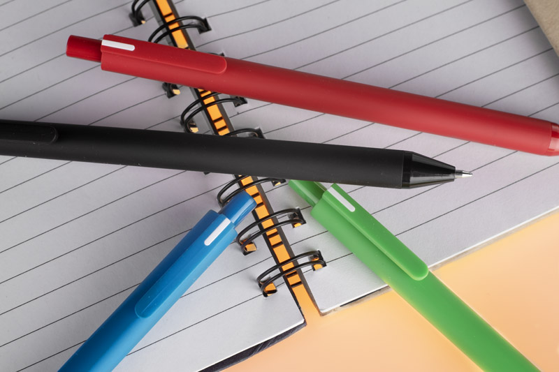 The FULKO ballpoint pen is made of plastic with a soft touch coating that gives it a matt, pleasant feel. The mechanical ejection system ensures comfortable use and the oil-based ink with a writing thickness of 0.7 mm guarantees smooth and even writing. The distinctive clip with white detailing gives the pen a recognisable look and a modern touch. FULKO is a practical promotional gadget that combines simple form with functionality.