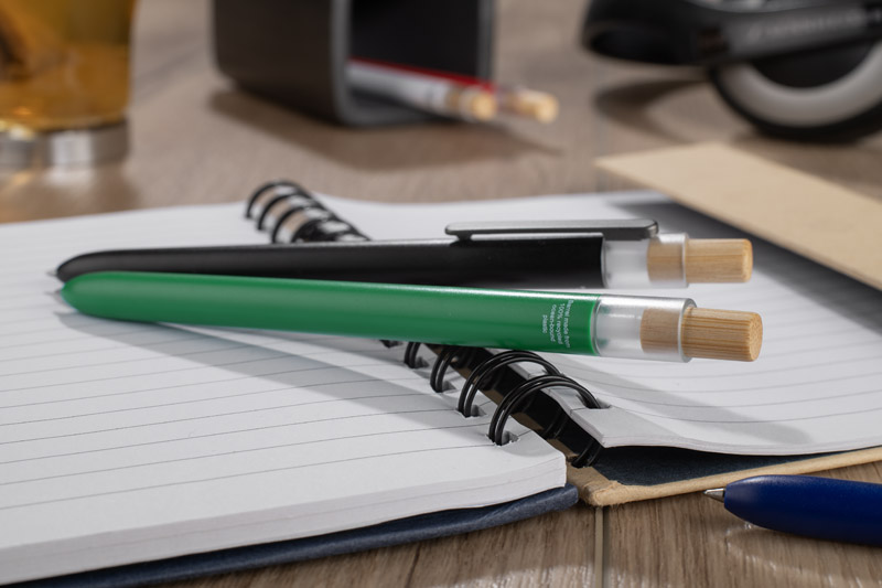 The OCEANO pen is made from material derived from ocean bound waste – plastics collected from coastal areas before they end up in the seas and oceans. It has a lacquered barrel, a bamboo button and a metal clip, giving it a modern look and a pleasant finish. The automatic mechanism makes it easy to use on a daily basis and the G2 type refill with 0.5mm gel ink writing thickness ensures smooth and precise writing.