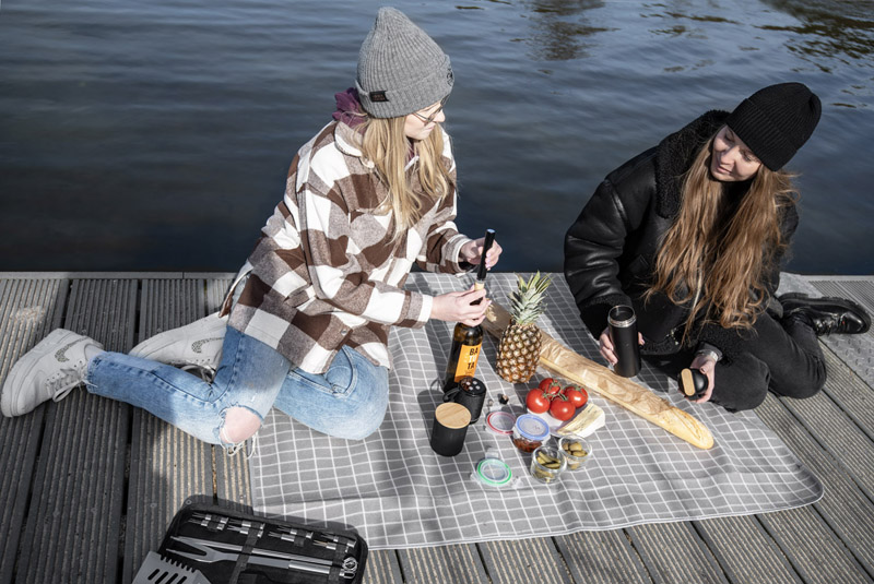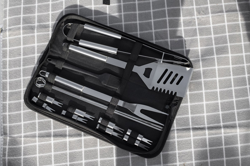 The ROLAN grill set in a polyester case contains 16 elements with steel handles: 4 skewers, tongs, a spatula with a bottle opener, a fork, 8 corn cob holders and a silicone brush.