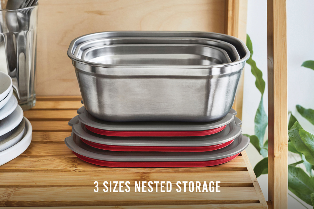 This set of three microwavable stainless steel meal prep boxes is designed for everyday use—lightweight, durable, and airtight. Whether for breakfast, lunch, or snacks, they’re ideal for food storage, on-the-go lunches, or oven-to-table meals. Each container features an innovative microwave-safe steel construction, with a vacuum-sealed, leak-proof lid that keeps food fresher for longer. The semi-transparent lid lets you see what’s inside at a glance, while the high-quality stainless steel base is dishwasher-, freezer-, and oven-safe (lid not oven-safe). The removable seals make cleaning effortless. The unique lid-lock vent allows you to microwave your food without removing the lid, reducing heat-up time and preventing splatter. Designed to nest for compact storage or stack when using the same size, these BPA-free containers offer smart functionality for every meal.