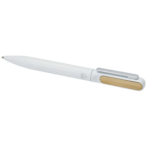 The Blanca ballpoint pen has an upper barrel made of recycled plastic with a coloured spray coating, and bamboo accessories on both sides. The lower part of the barrel is made of recycled aluminium with a coloured spray coating. Ink colour: Black. Writing length: 400 metres. Nib size: 1.0 mm.