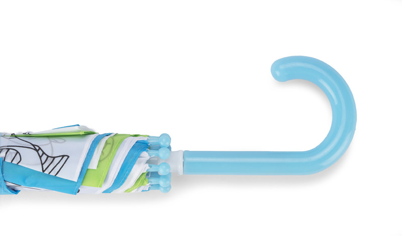 KIDDI umbrella for children decorated with marine models designed by Blue Collection graphic artists. The set includes 6 waterproof markers for colouring the umbrella. Manual umbrella made of polyester.