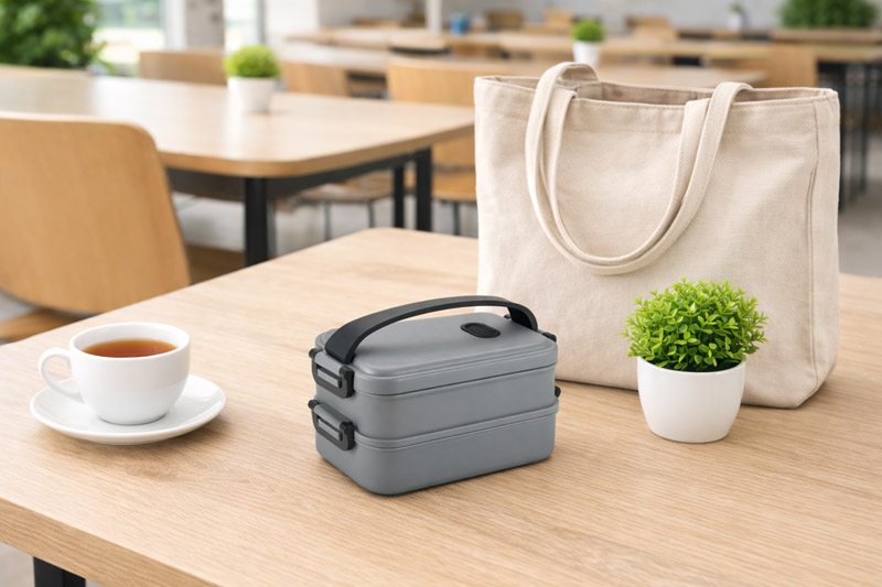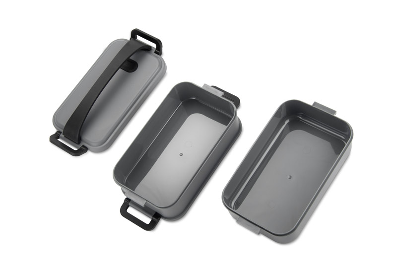The MUNCH 1500 ml container is a practical solution for storing and carrying meals at work, school or on the move. It consists of two tiers that can be easily joined together using the elastic fastener. When folded, it takes up little space, making it easy to transport and store. The top lid has a rubber grip for increased carrying comfort. Thanks to its sturdy construction, the container keeps food well protected from spills. Ideal as a corporate gadget – available with labelling service.