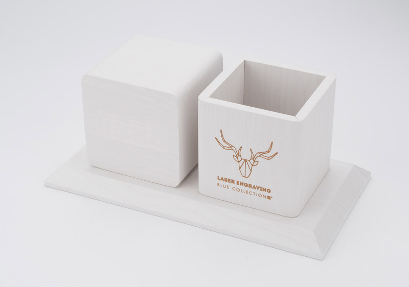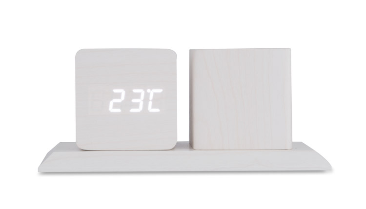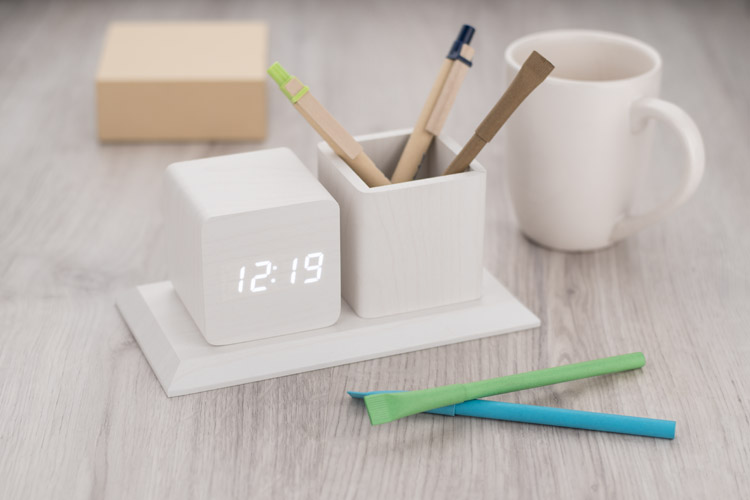 Organizer for a desk made of MDF panel with a fashionable finish in light wood colour which fits to modern interior. It has a container for pens and clock with the following functions: calendar, alarm and thermometer.