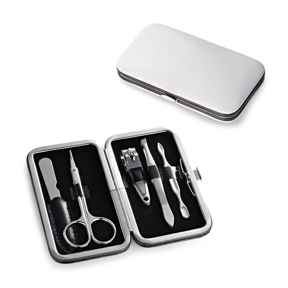 Five-piece manicure set with nail file, scissors, nail clipper, tweezers and cuticle pusher. Supplied in a PU case