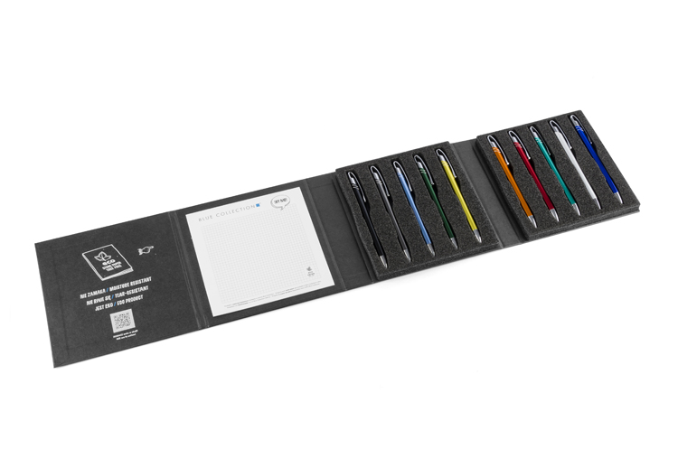 Modern and stylish etui containing 10 most popular metal pens from Blue Collection offer. Well-made will impress everyone, who is holding it. It will be ideal tool for presentation, thanks to inside placed notepad made of stone paper, will give possibility to test pens.
