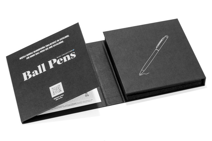 Modern and stylish etui containing 10 most popular metal pens from Blue Collection offer. Well-made will impress everyone, who is holding it. It will be ideal tool for presentation, thanks to inside placed notepad made of stone paper, will give possibility to test pens.