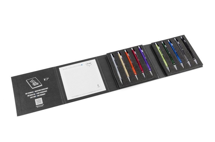 Modern and stylish etui containing 10 most popular metal pens from Blue Collection offer. Well-made will impress everyone, who is holding it. It will be ideal tool for presentation, thanks to inside placed notepad made of stone paper, will give possibility to test pens.