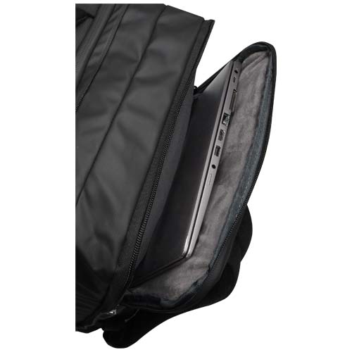 The expandable and sturdy GRS certified Expedition Pro laptop backpack is the ultimate choice for professionals constantly needing to juggle travel and work. The backpack has expanded capacity equivalent to a carry-on trolley, and it’s made from water repellent RPET, coupled with premium PU elements and RPET lining. It features a dedicated 17″ laptop compartment and a tablet sleeve, an expandable trolley style compartment for storing clothing, an integrated leak-proof large pocket for toiletries, and a spacious front compartment with multiple organisational pockets inside and outside. Constructed with padded and adjustable shoulder straps, an integrated card sleeve pocket, a sunglasses loop, moulded air mesh backing as well as a padded handle, ensuring maximum carrying comfort and convenience. Volume capacity: 35 litres. PVC free.
