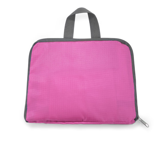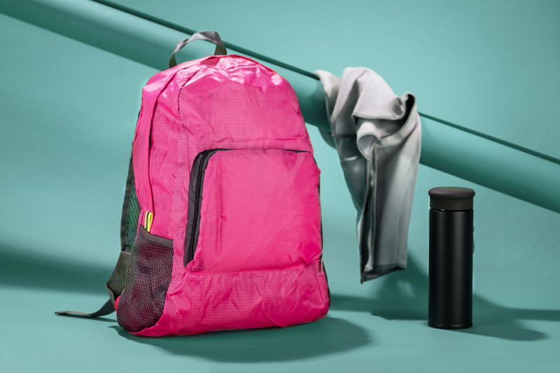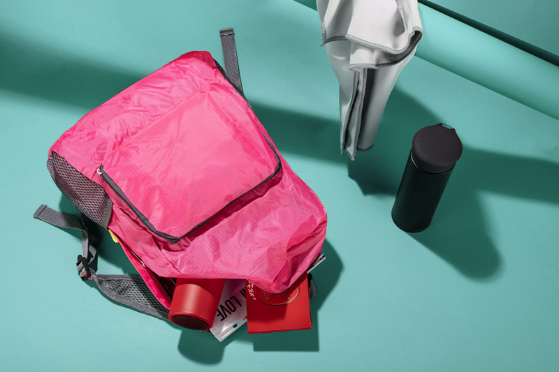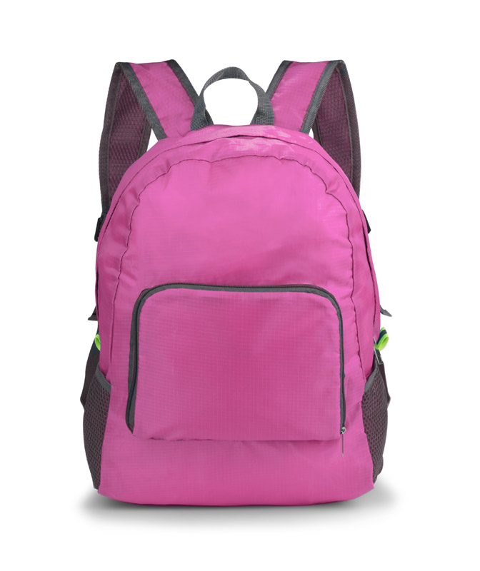 Functional backpack that can be folded to a compact size. It has one inner pocket and three external ones – one with a zipper and two with net. The backpack is made of polyester.