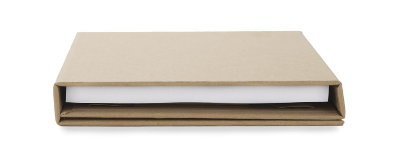 Trendy, eco-friendly notebook that contains a ruler, sticky notes, a place for business cards and a pen. Logo might be imprinted on the notebook.