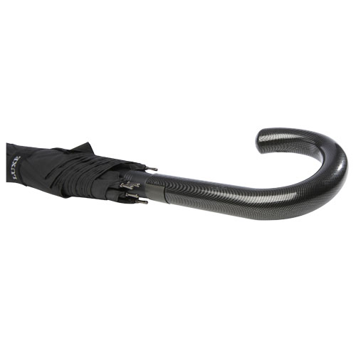 Automatic opening umbrella with a pongee polyester canopy, and a sturdy black plated metal shaft. The high quality full fiberglass frame offers maximum flexibility in windy conditions. Crooked handle with a carbon look finish and black nickel plated tips. Luxe branded details on woven label on the canopy and the closure strap. Large decoration area on each of the panels.