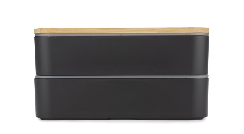 The COUPLE food container is made of plastic, has a bamboo lid and an elastic band to prevent accidental opening. The container consists of two interconnected chambers, placed one below the other, separated by a lid. The container can be used in a dishwasher, microwave oven and freezer.