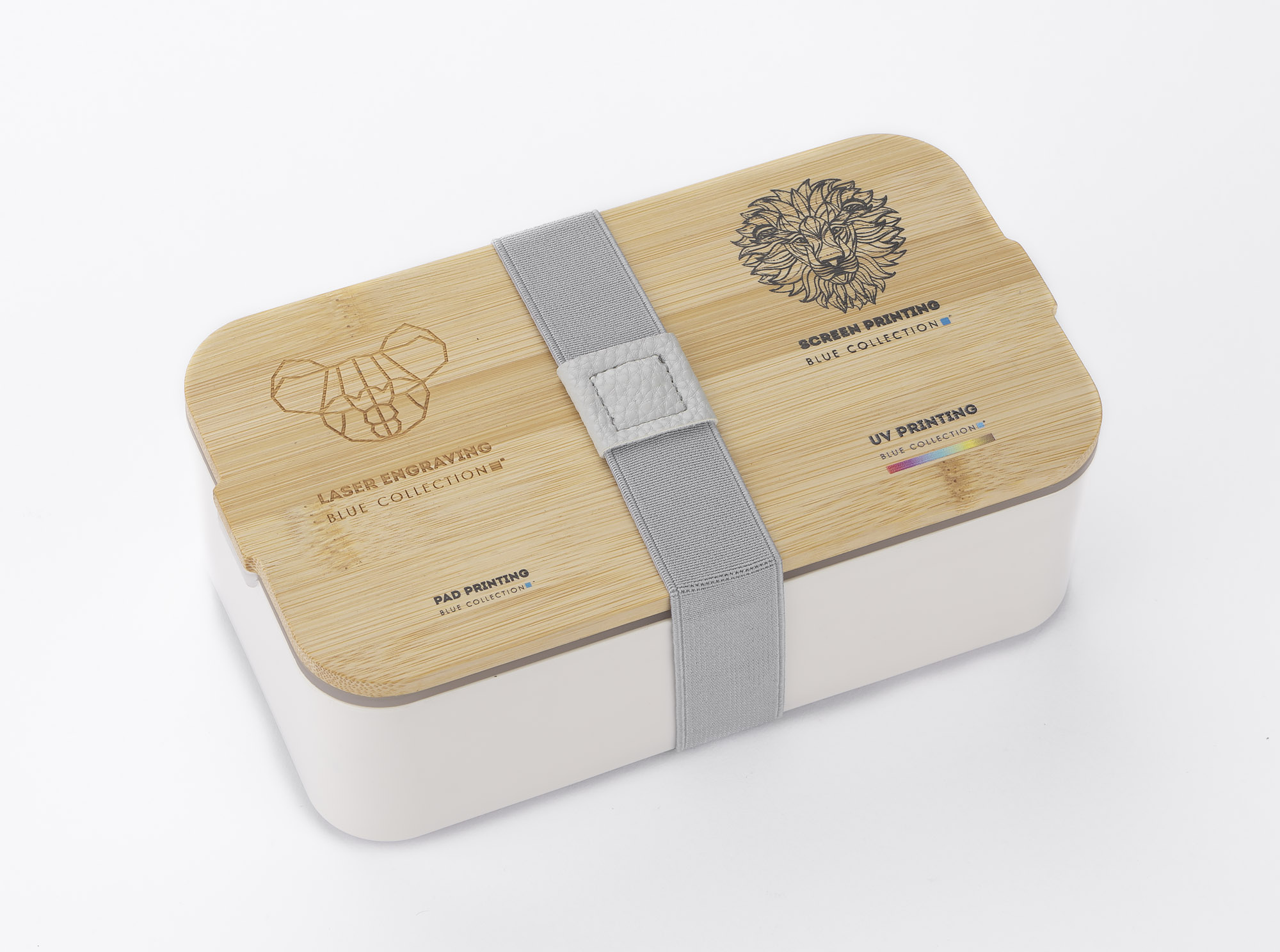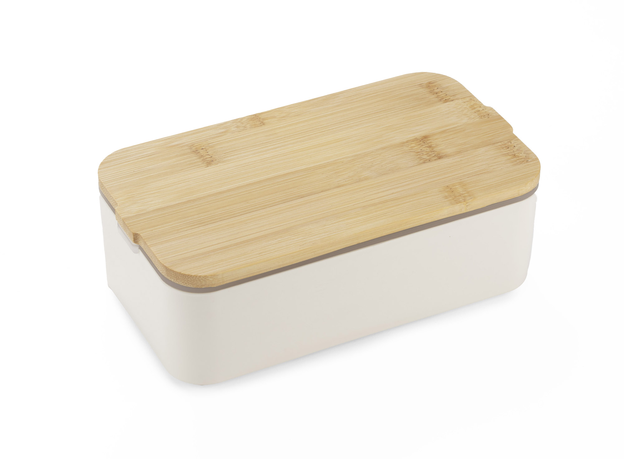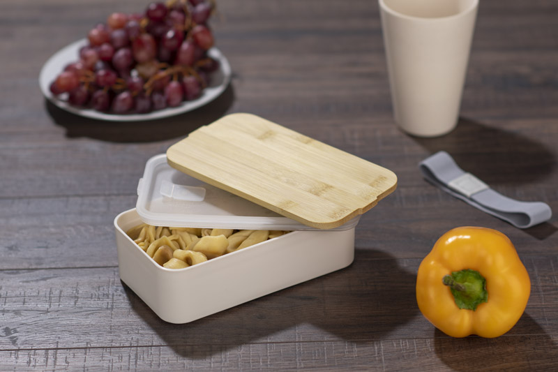 The SINGLE food container is made of plastic, has a bamboo lid and an elastic band to prevent accidental opening. It has one chamber. The container can be used in a dishwasher, microwave oven and freezer.