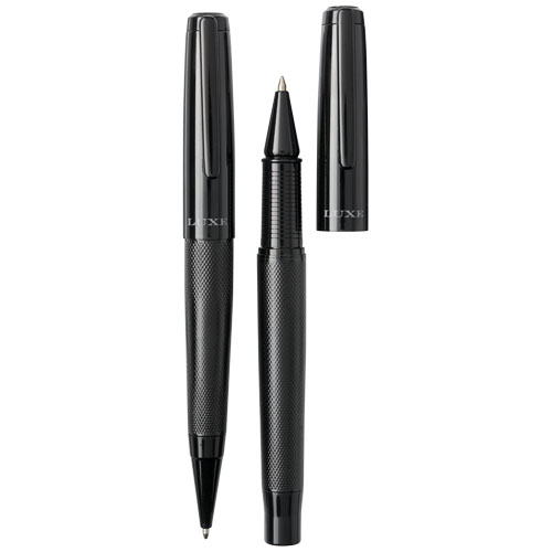 Ballpoint pen and rollerbal pen gift set with black upper and lower barrel with a glossy finish, delivered in a Luxe gift box. Ballpoint pen: 14 cm x 1.45 cm, weight: 40 gr, writing length: 800 m. Rollerbal pen: 13.8 cm x 1.45 cm, weight: 54 gr, writing length: 400 m.