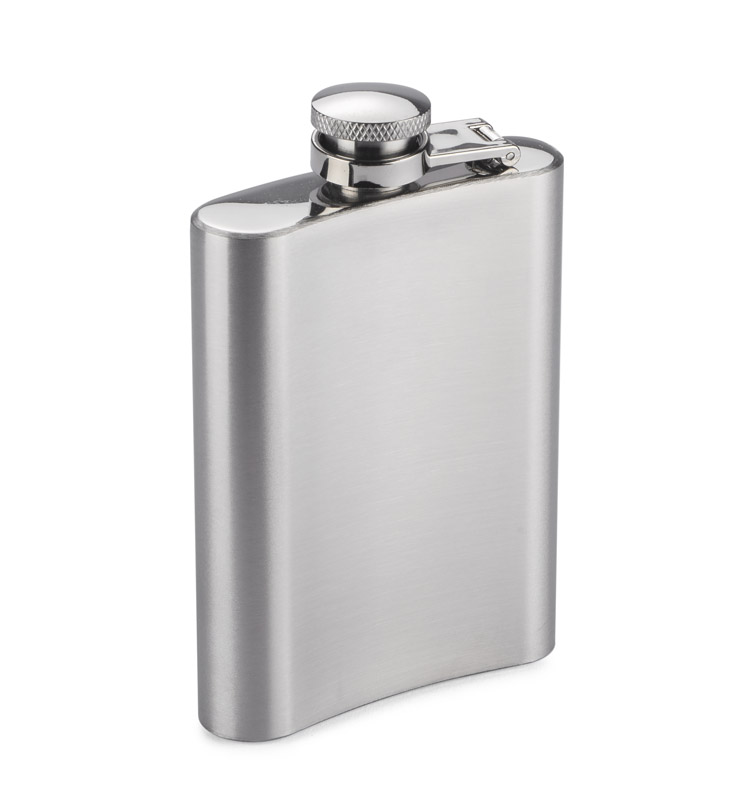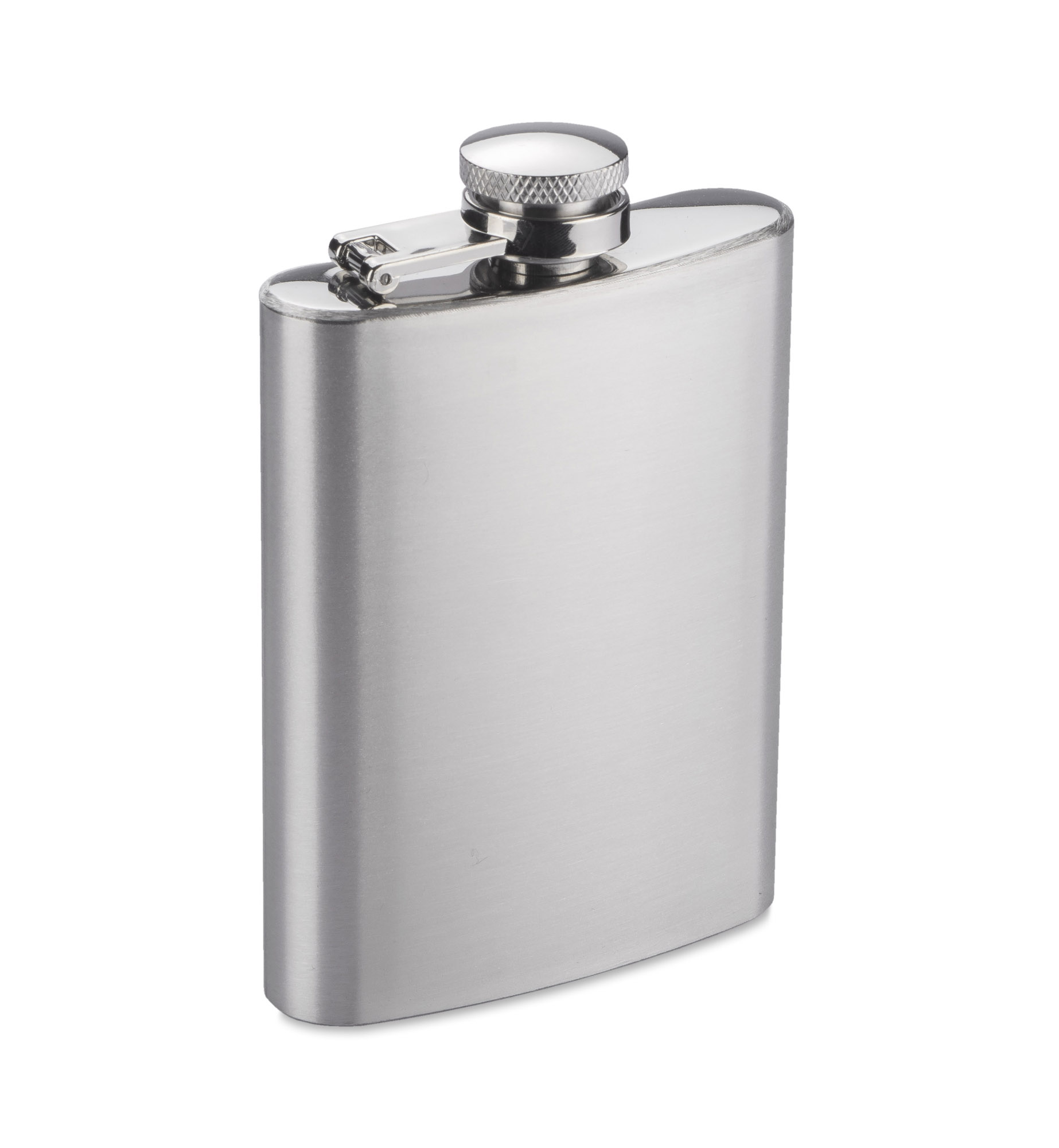 Stainless steel 110ml hip flask with a safe closure. Logo might be engraved on the article’s surface.