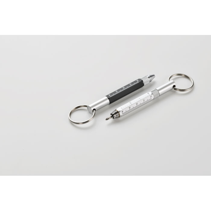 Key ring with twist action pen in recycled aluminium with 4cm/ 1,5 inch ruler, stylus and 2 in 1 phillips and flat head screw driver. Black ink.