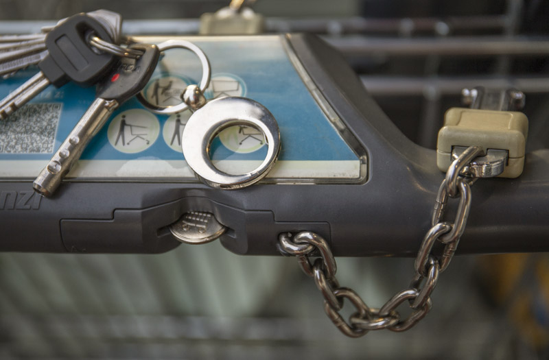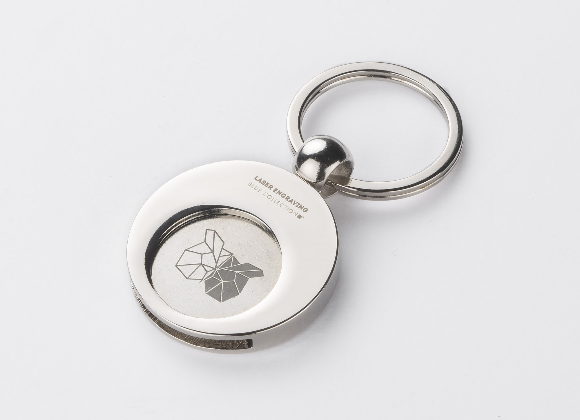 Metal keychain with a token, a chromed surface. This token fits supermarket trolleys. Engraving is possible to make on the token.