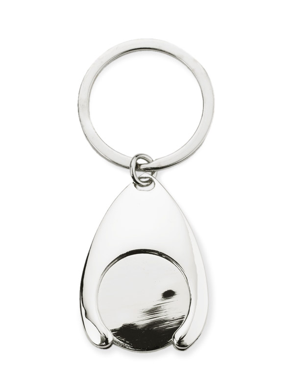 Metal, chrome-plated keychain with a coin. Packed individually into a black cardboard box. Logo engraving might be made on the coin.