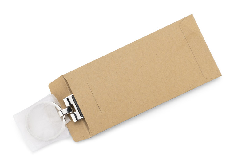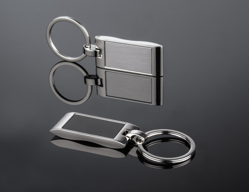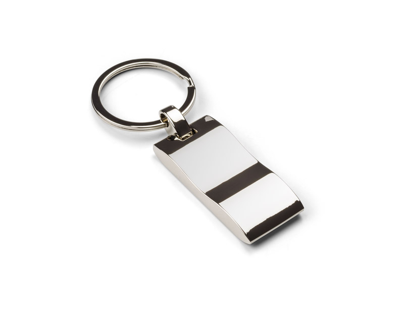 Metal keychain with rectangular, wavy pendant. Logo will be engraved on the surface of the pendant.