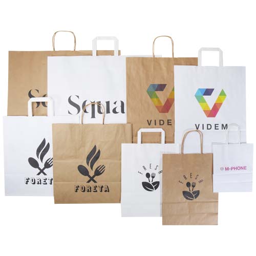 Sample box including 9 paper bags made from kraft paper in 5 different sizes (18 x 8 x 21, 25 x 11 x 32, 32 x 12 x 40, 34 x 20 x 35, 49.5 x 14 x 44 cm). For each size there is 1 bag with flat handles, and 1 bag with twisted handles, except for the smallets size that is only available with twisted handles. Made in Europe.