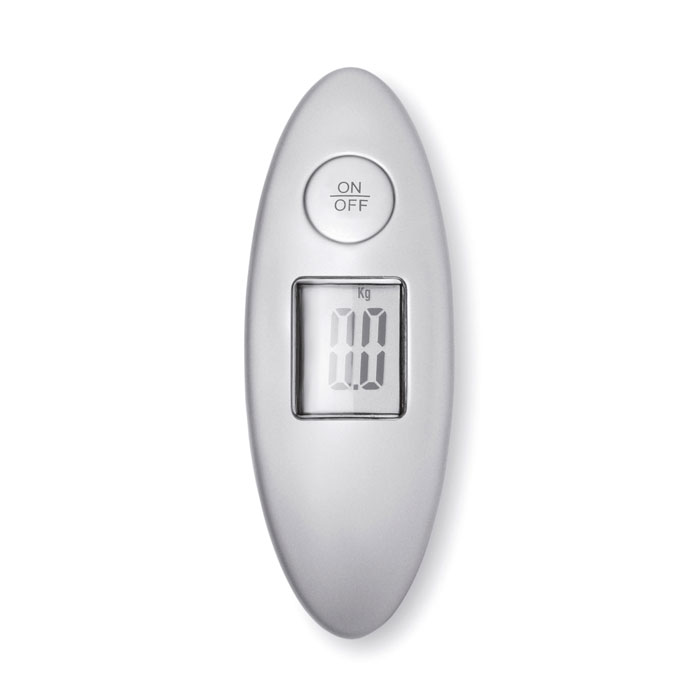 Luggage scale in ABS casing. Maximum capacity measure: 40 kg. Unit measure in kilogram or pounds. Powered by 1 cell battery included. Individual packaging in silver carton box.