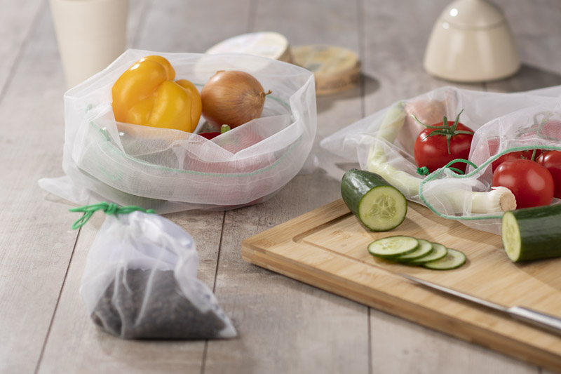 A set of bags that is a shopping must-have nowadays. Made of recycled polyesterin in the idea of „less waste”. The set consists of 2 larger bags (size 320 x 340 mm) and one smaller (size 175 x 150 mm) which is also a pouch which can be used to conveniently store the set. The small pouch is made of smooth polyester on one side.