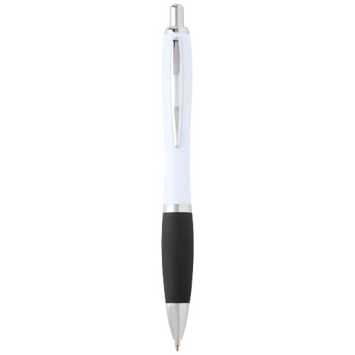 The Nash ballpoint with a stylish curvy design and a soft grip is made of recycled plastic that is hard and solid and thus offers a long life span. Ink colour: Black. Writing length: 1000 metres. Nib size: 1.00 mm.