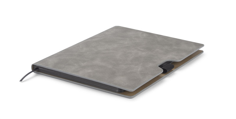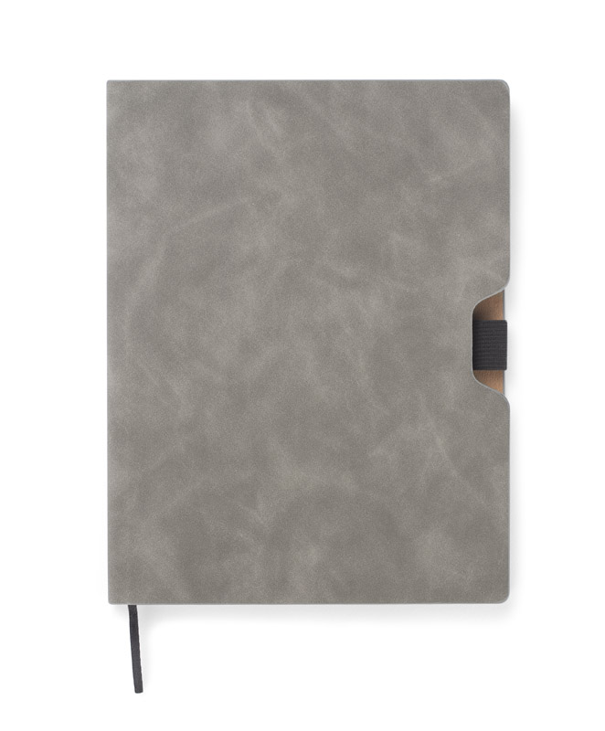 BLAKK is a classic notebook with a cover made of leather-like material (PU) in gray color. The black edges of the pages give it an elegant look. The notebook contains 80 white lined pages made of paper. The cover has an elastic band – pen holder and a black bookmark – ribbon.