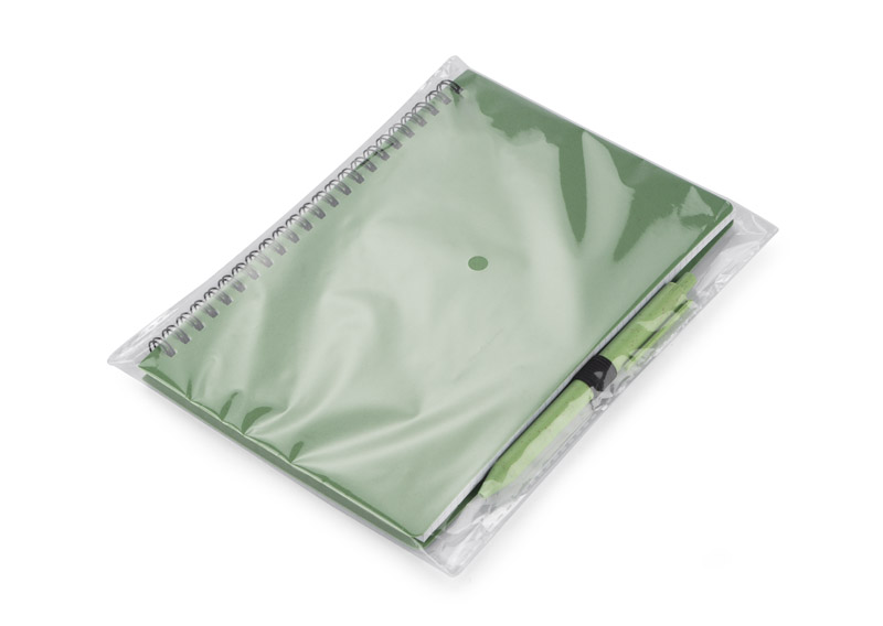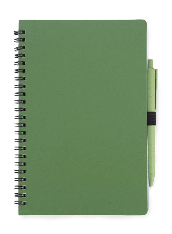 TRESA notebook with a pen, colour-matched to the cover. The pen and cover of the notebook are made from wheat straw. Spiral-bound notebook with 70 sheets of checked, recycled paper. Format A5. Ballpoint pen refill in blue.