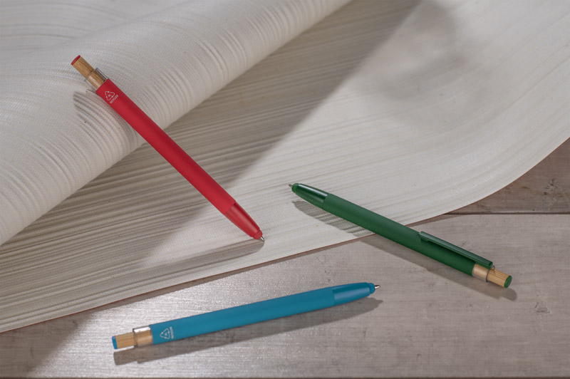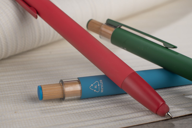 The ALPEN ballpoint pen combines modern design and writing comfort. Made from recycled aluminium with a soft touch rubberised finish, it ensures comfortable use every day. It features a touch pen function for touch screens and a metal clip for easy attachment to a notebook or pocket. The distinctive bamboo button adds a natural touch and the colourful details enhance its modern style. The G2 type nib with a line thickness of 1.0 mm guarantees smooth writing and high durability.