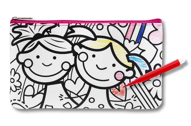 A pencil case with a pattern for colouring by oneself. A gift that involves and brings joy. Markers in 6 colours included. A one-compartment pencil case with a zip-lock.