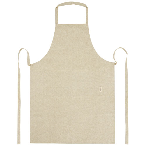 Apron made of 200 g/m² recycled cotton polyester blend. Features 2 adjacent pockets with a combined size of 45 x 20 cm, and a 1 metre tie back closure. Recycled cotton is manufactured from pre-consumer waste generated by textile factories during the cutting process. Due to the nature of recycled cotton, there may be a very slight colour variation. This feature distinctly adds to a more authentic appearance. Length of the neck strap: 55 cm.