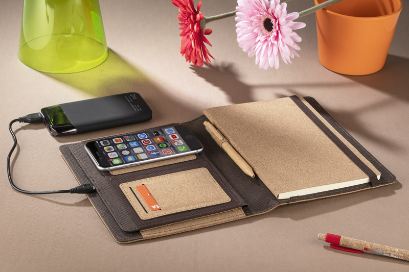 The CHARCO folder is a product combining the comfort of use and a natural design. Inside, it has an integrated wireless 5 W charger, replaceable 64-sheets A5 notebook with cork covers, business card pockets, a pocket for small office accessories and a ball pen space. The kit comes with a cord for connecting the wireless charger. The cover is made of natural cork. The folder is closed with an elastic band. It is packed in an elegant, simple paper box.