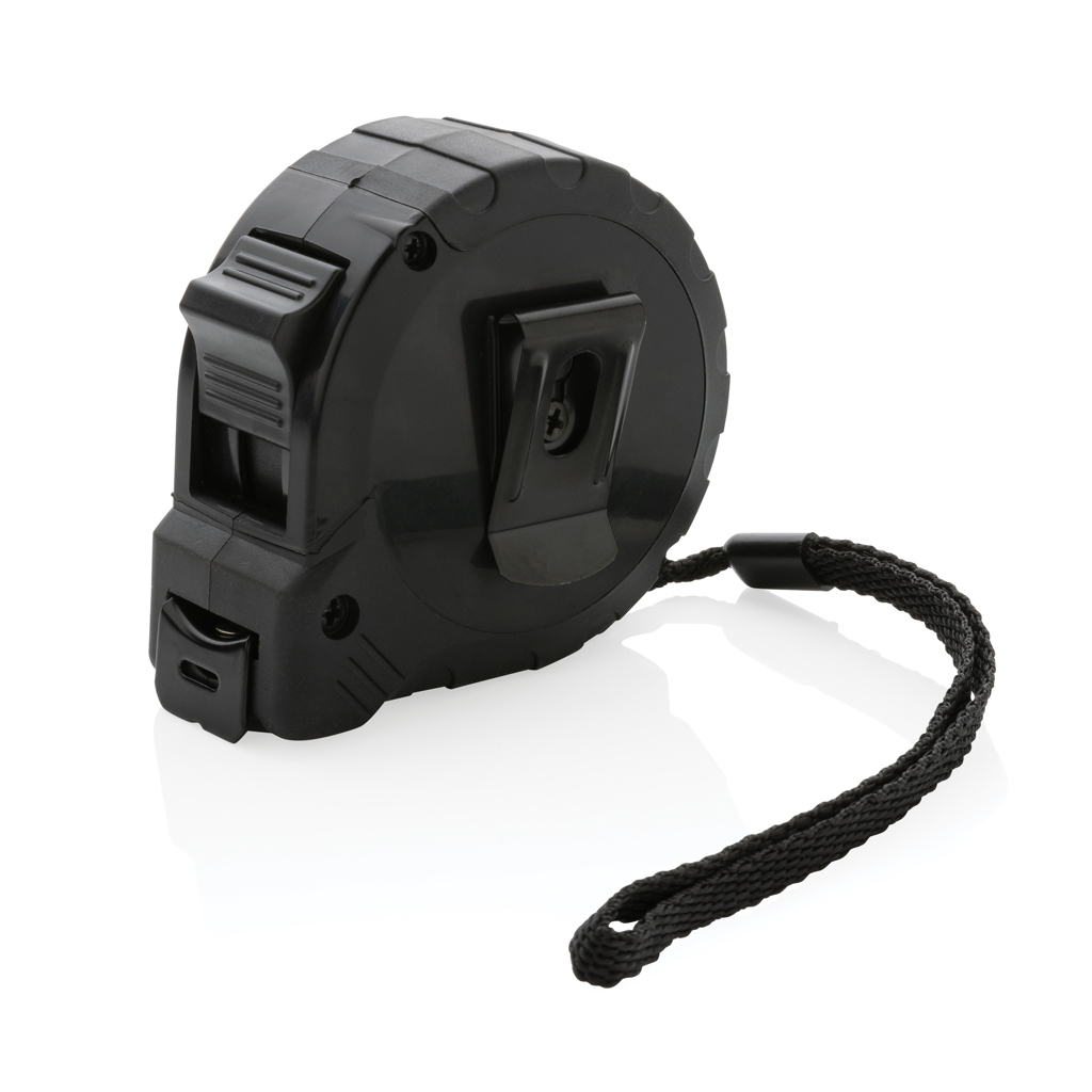 5 metre tape made with RCS (Recycled Claim Standard) certified recycled ABS. Total recycled content: 15% based on total item weight. RCS certification ensures a completely certified supply chain of the recycled materials. With deluxe TRP rubber grip for smooth hold. With release/lock button and extra hold button on the side. With 19mm single sided tape, yellow with black carbon steel hook. With polyester wrist strap. Packed in FSC® mix kraft packaging