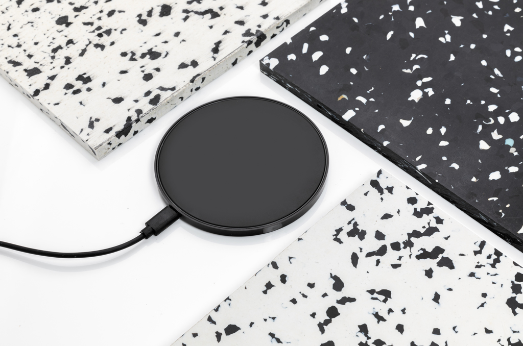 10W wireless charger with dual connector cable (USB A and USB C) where the case is made out of RCS certified recycled ABS plastic and the wire from recycled TPE. Total recycled content 58% based on total item weight. RCS (Recycled Claim Standard) is a standard to verify the recycled content of a product throughout the whole supply chain. RCS is the standard that is used when a part of the item has been made from recycled materials. Wireless charging compatible with Android latest generations, iPhone 8 and up. Input: 9V/1.5A. Wireless Output: 9V/1.1A 10W. Item and accessories PVC free. Including 150 CM PVC free recycled TPE cable that offers connection to both from USB A and type C adapters.