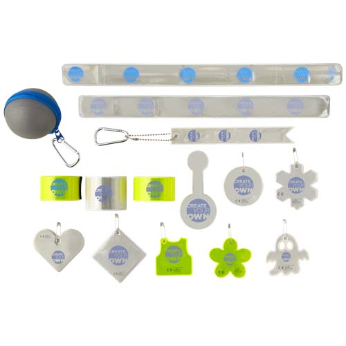 Includes 5 slap-wraps, 8 reflective hangers, 1 reflective magnet, 1 reflective meteor and 1 reflective product catalogue. Products are manufactured in Europe are tested and certified to meet the EN17353:2020 standard Type B1 and B2, guaranteeing high quality and visibility.