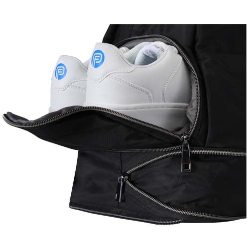 The Rhine expandable duffel bag effortlessly transforms itself with style for varied occasions with its sleek design and versatility. Crafted with high-quality recycled nylon, soft RPET lining, and premium PU leather elements. The duffel bag features a spacious main compartment with a large leak-proof TPU pocket, 2 sleeve pockets, a dedicated shoe compartment, a secure hidden pocket on the back (doubling as trolley strap), and detachable shoulder straps that can be adjusted for maximum comfort. What truly sets this duffel bag apart is the expandable layer, which can be extended up to 42 litres capacity. Capacity: 35-42 litres. Resistance up to 20 kg weight. PVC free.