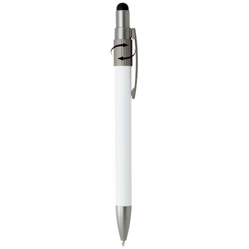 Ballpoint pen with stylus and fidget spinner, combining practicality with a playful design. The pen is made from RCS certified recycled aluminium and features a smooth push mechanism and a stylus tip for touchscreen use. A built-in fidget spinner on top adds a stress-relieving touch (just flick to activate). Pen ink colour: black. Writing length: 1000 metres.