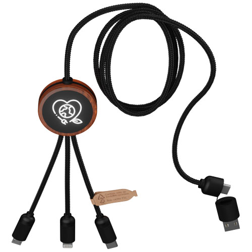 5-in-1 recycled PET light-up logo charging cable with round bamboo casing. The light-up logo is visible on both sides. Features 3 connectors (type C, micro USB, iPhone) and a dual USB connector for universal use. Delivered in a TPU pouch with a kraft paper card. Cable length: 1 metre. Includes 3 year warranty.