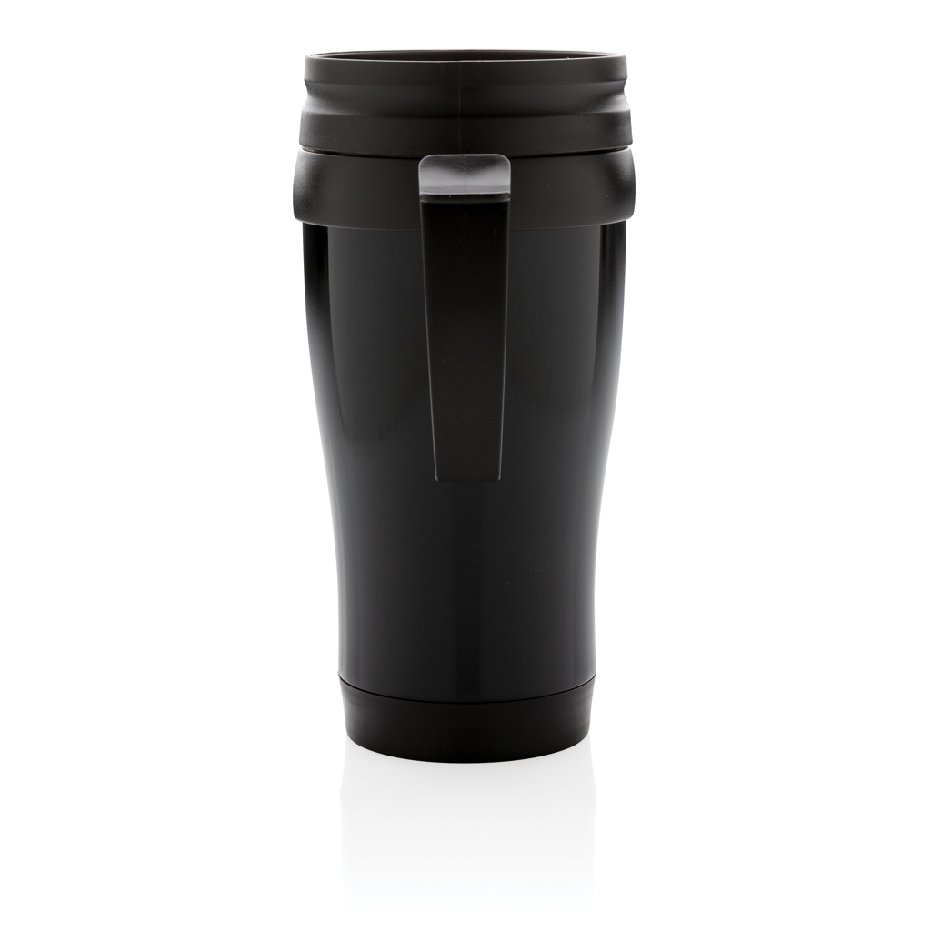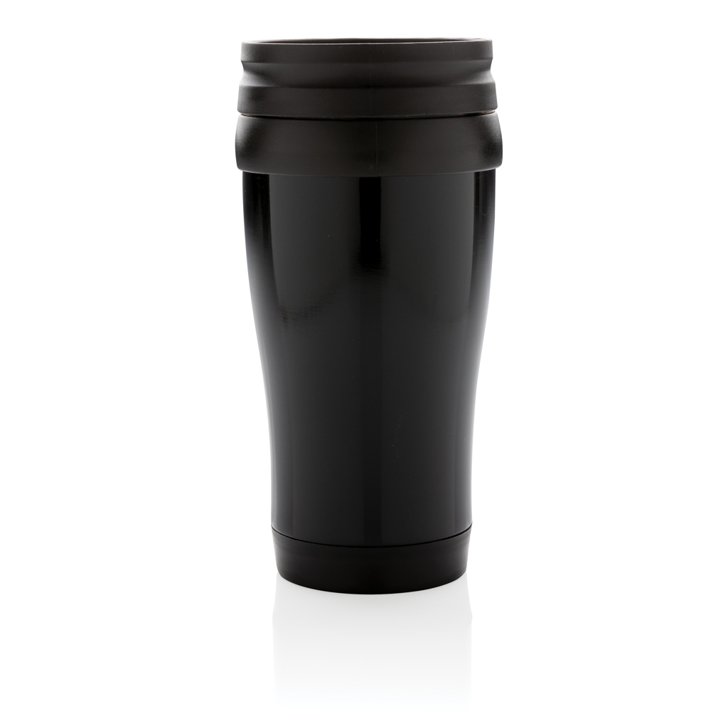 350ml stainless steel outside and PP inside mug with lid and base in black.