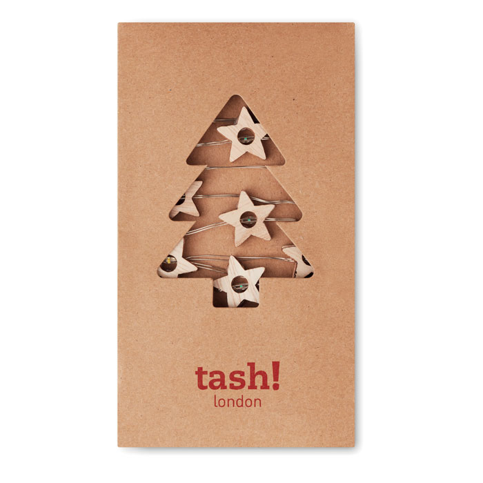String with 20 LED lights in wooden star shape. Presented in carton box. 2 AA batteries not included. On/off button in battery case.