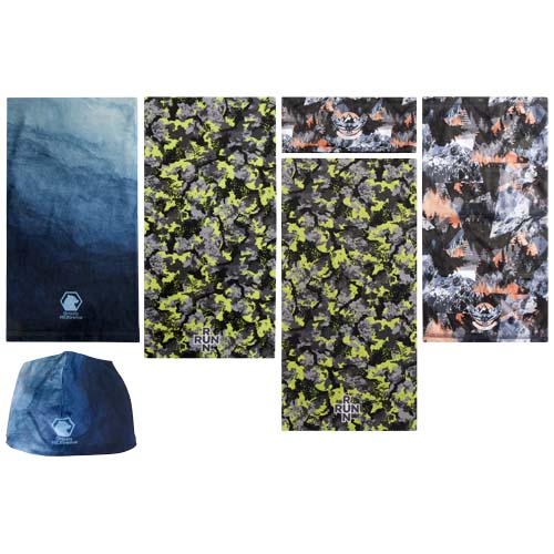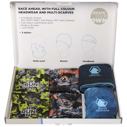 Sublimation headwear sample box with 4 multi-scarfs, 1 headband with Coolmax, and 1 fleece beanie. Made in Europe.