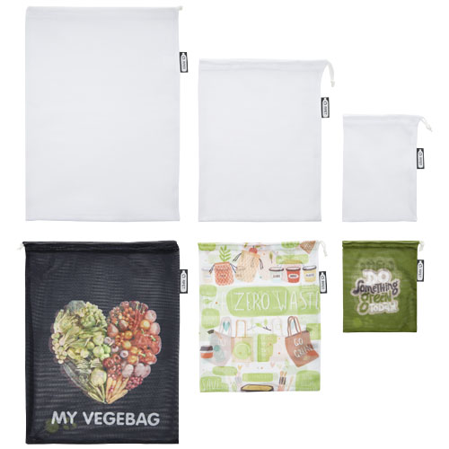 Sublimation sample box including 3 vegetable bags in different sizes (15×21 – 1PL035, 25×32 cm – 1PL036, 30×41 cm – 1PL037), all made from 100% recycled polyester. The box also contains a pair of shoe laces (98×1 cm), a multiscarf (49×23 cm), a cleaning cloth (18×18 cm), a luggage belt (154×4 cm), a lanyard with hook (98×2 cm), 2 lanyards with safety buckle and hook (104×2.5 cm/94×1.5 cm), a keychain (34×1.5 cm), a bracelet with locking slider (32×1.5 cm), and a bracelet with removable locking slider (32×1.5 cm). Made in Europe.