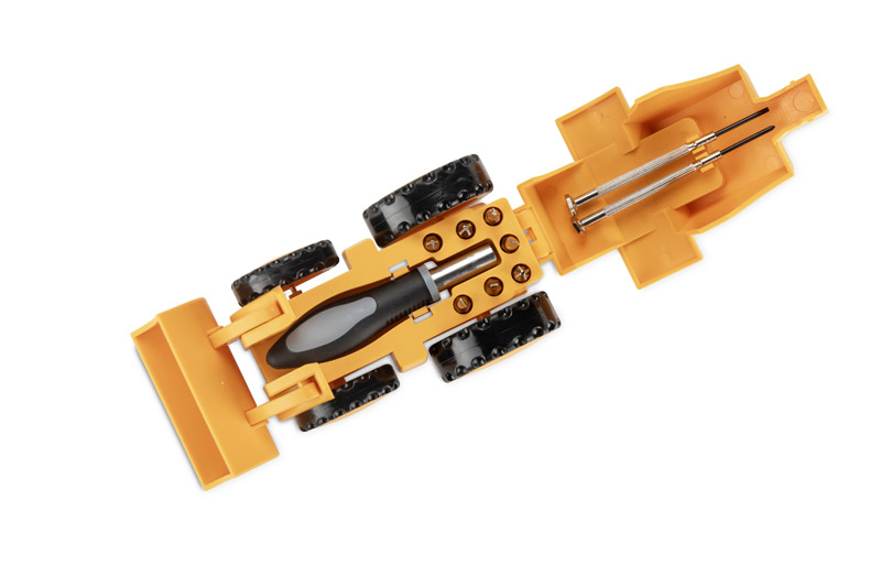 The DREX tool set is a practical gadget hidden in the unusual form of an excavator. When the case is opened, the interior conceals a set of bits, a classic screwdriver and two precision screwdrivers, useful for small repairs. The compact design means that all components are well organised and always at hand. Functionality combined with an original design makes the DREX an interesting promotional gift, especially for the construction and technical industry. Thanks to the possibility of logo labelling, it also becomes a practical advertising medium.