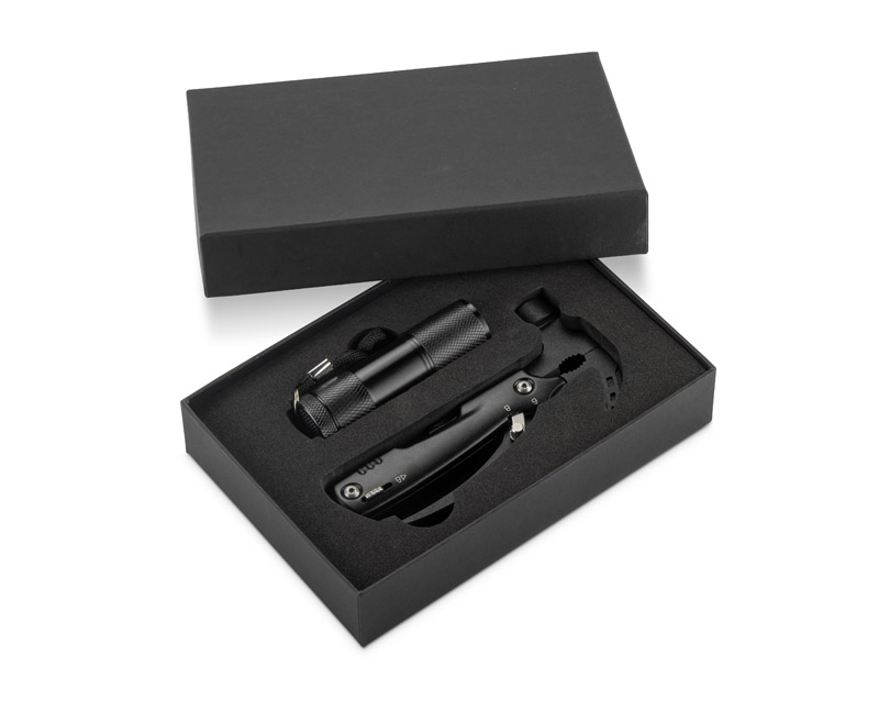 The ZAXO tool set is a practical combination of a torch and a multitool that will come in handy in various situations – at home, in the workshop or when travelling. The multitool is equipped with the necessary accessories: hammer, saw, knife, Phillips screwdriver, beer opener, double-edge saw and pliers. Thanks to its compact form, all tools are always at hand. The torch is a useful addition to the set, increasing its versatility. The whole set is packaged in a cardboard box, which also makes ZAXO a good choice for a practical promotional gift.
