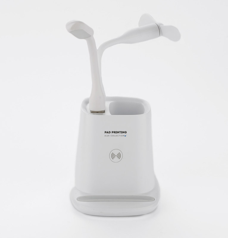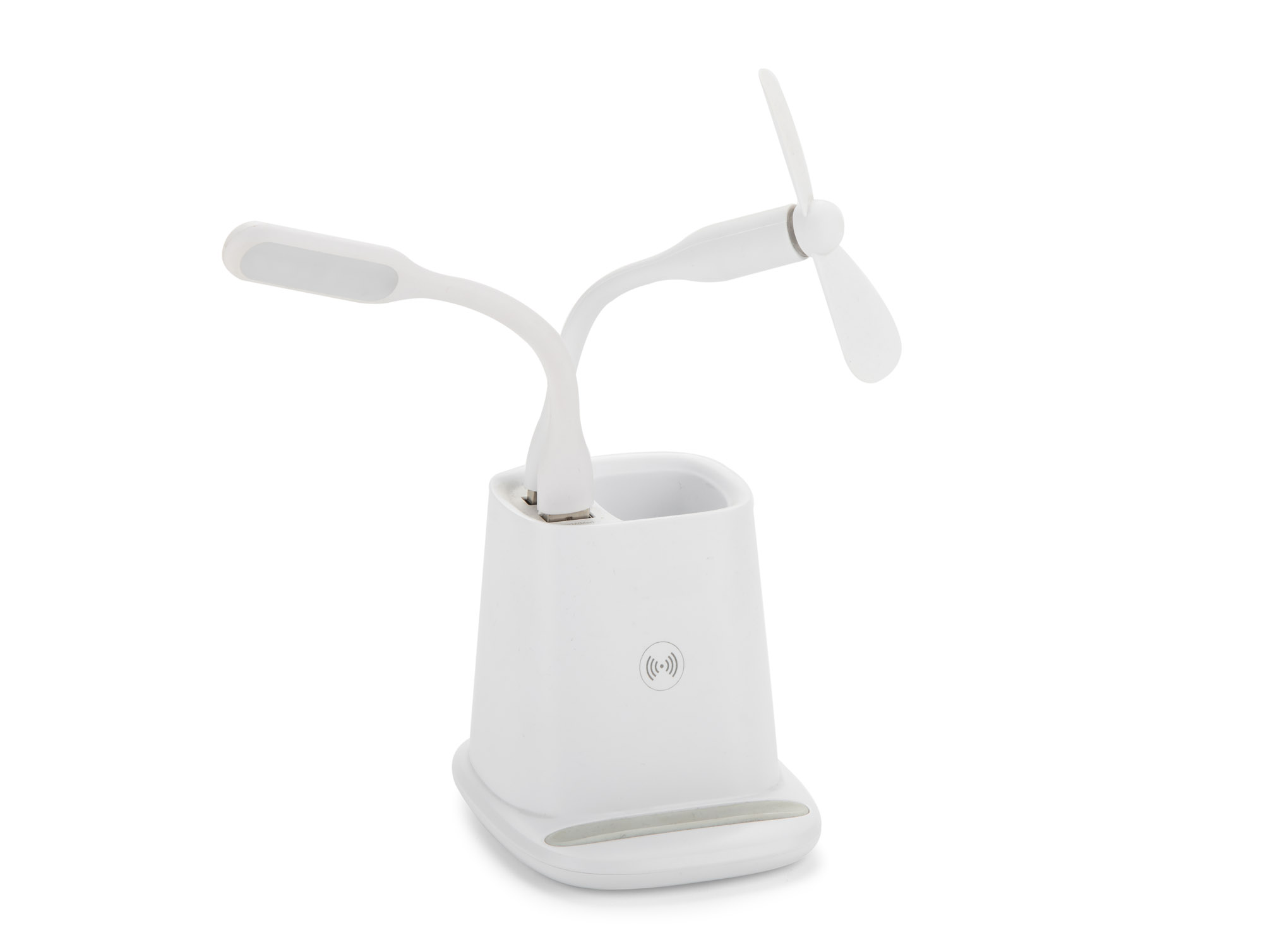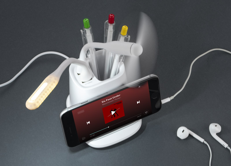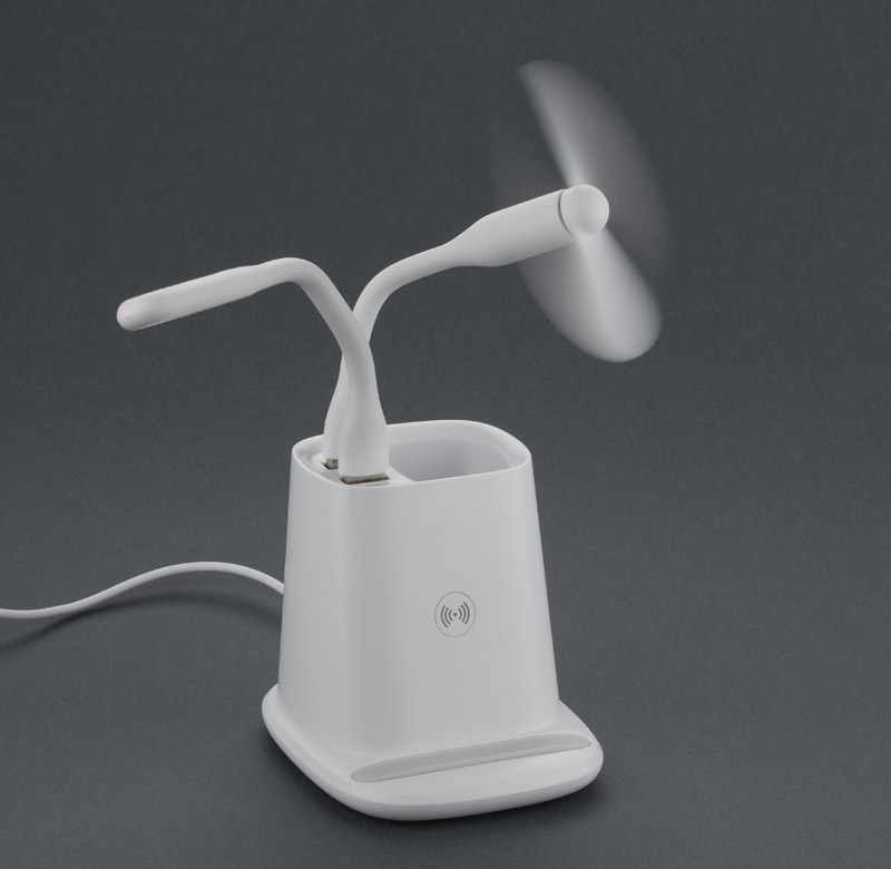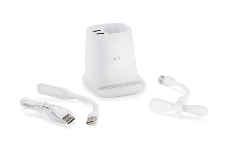 The BERGO desk organizer is the perfect gadget for working at a desk. It has a built-in wireless charger that also serves as a phone stand and two USB ports that will power the accessories included in the product: a fan and a lamp. When not using accessories, the USB ports can function as hubs. Specifications: Micro USB input: 5V / 2A, Wireless charger output: 5W, 2 USB outputs: 5V / 2A (max.)
